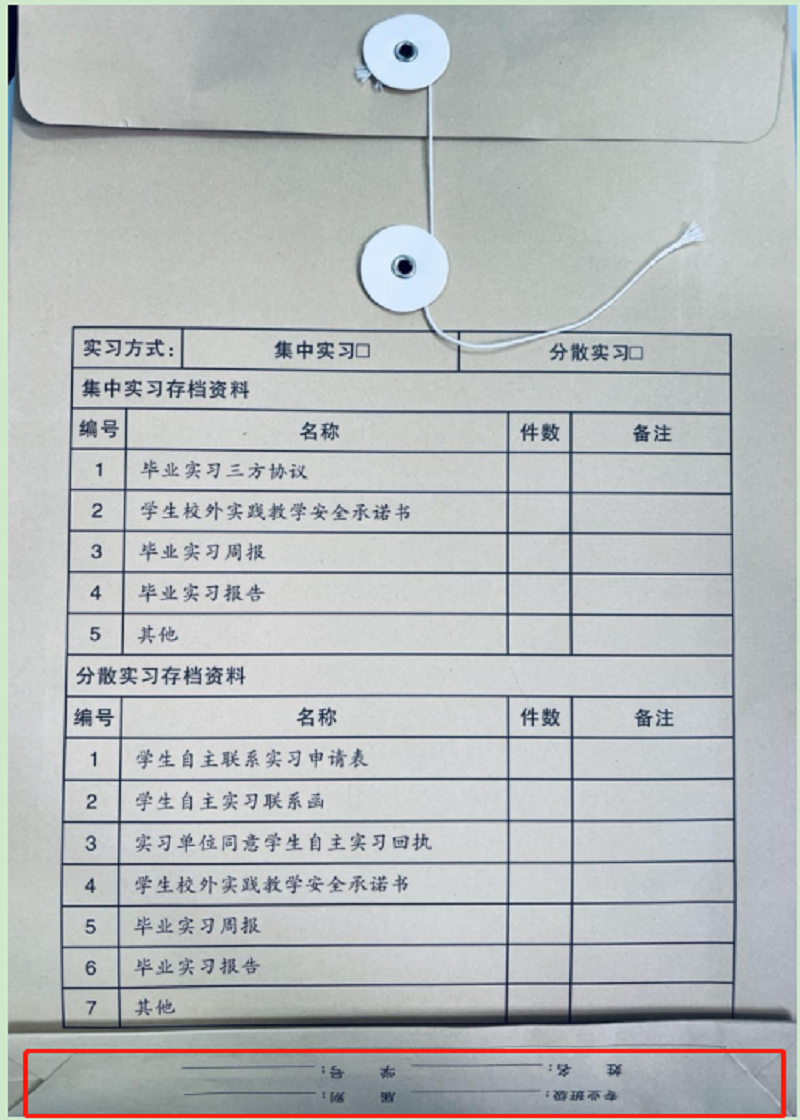 以上毕业实习材料采用纸质材料归档,按照顺序依次装入统一专用档案袋内,档案袋封面和底部需按照目录填写完整注明“件数”等信息。如图1、图2所示: